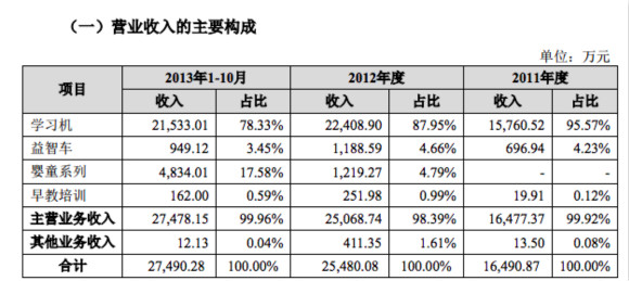 學(xué)習(xí)機(jī)是嘉達(dá)早教的主打產(chǎn)品。2014年在嘉達(dá)早教收入構(gòu)成中,學(xué)習(xí)機(jī)產(chǎn)品實現(xiàn)營收金額為2.49億元,占據(jù)營業(yè)收入的比例為79.23%。2011-2013年,學(xué)習(xí)機(jī)產(chǎn)品營收金額分別為:2.60億元、2.24億元、1.58億元,占比分別為:86.89%、87.95%、95.57%。嘉達(dá)早教營收對學(xué)習(xí)機(jī)的依賴,可見一斑。