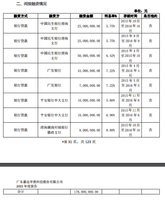 為了資本運作,從2015年9月份到2015年11月份,短短3個月里,嘉達(dá)早教從銀行貸款7800萬元。而這一年,嘉達(dá)早教通過銀行融資,共計1.78億元。
