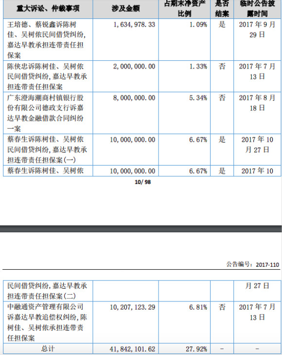 2017年財報顯示,嘉達(dá)早教2017年上半年營收僅為411.8萬元,比去年同期減少5300萬元,降幅達(dá)92.79%;公司與實控人陳樹佳眾多官司纏身,上億資產(chǎn)已被查封、凍結(jié)。