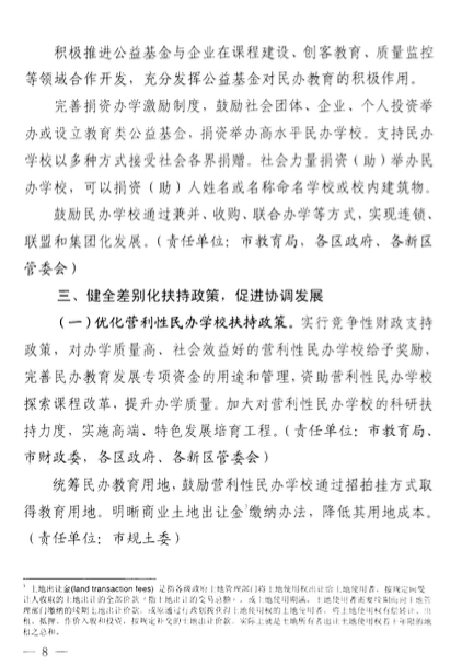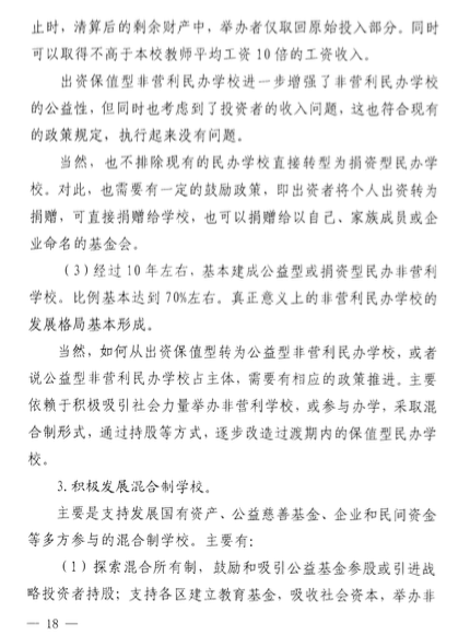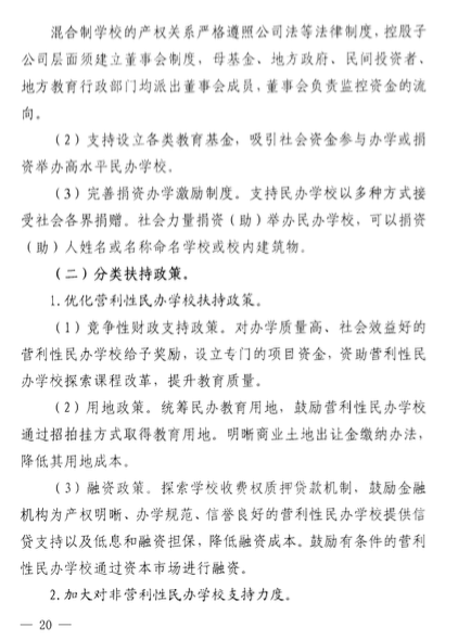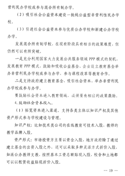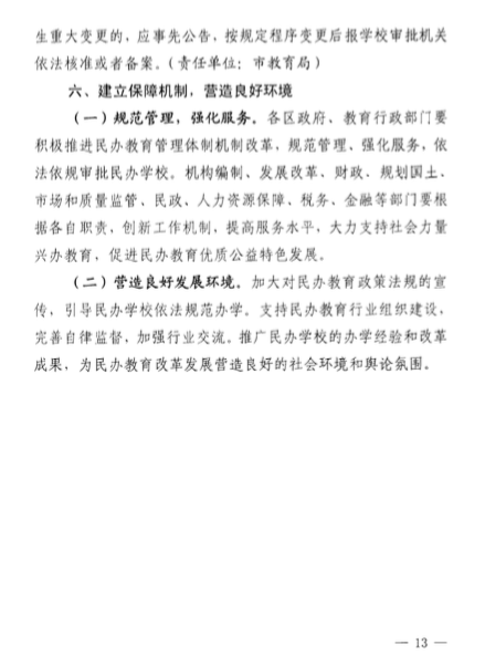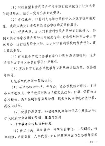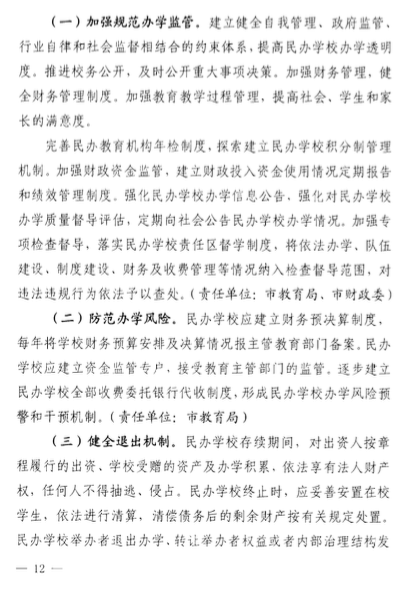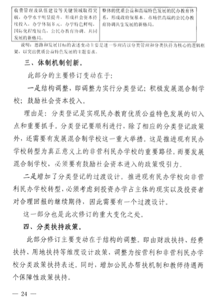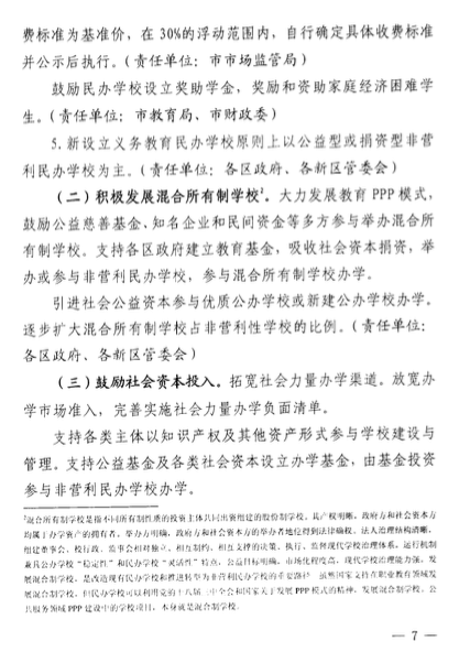 該意見(jiàn)還包括了關(guān)于民辦學(xué)校的學(xué)費(fèi)收取、學(xué)費(fèi)調(diào)整時(shí)間、教師培訓(xùn)、多種資本投資民辦學(xué)校、降低民辦學(xué)校辦學(xué)成本、鼓勵(lì)通過(guò)并購(gòu)的方式實(shí)現(xiàn)集團(tuán)化辦學(xué)等等。