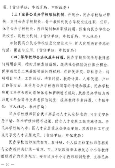 開(kāi)展公、民辦學(xué)校結(jié)對(duì)幫扶,支持公辦學(xué)校老師到民辦學(xué)校交流、掛職,保留原公立學(xué)校老師的編制、待遇。