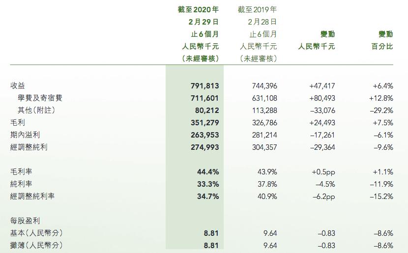 截至2020年2月29日止6個月, 學費仍為主要的收益來源,占收益總額的89.9%以上。