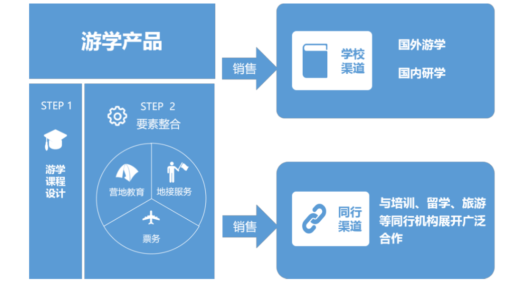 轉(zhuǎn)型后,公司主營業(yè)務(wù)以游學(xué)為主。進(jìn)行游學(xué)課程的設(shè)計(jì),整合與課程內(nèi)容相關(guān)的營地服務(wù)、地接服務(wù)、票務(wù)等相關(guān)資源,通過學(xué)校以及同業(yè)渠道銷售給消費(fèi)者。如下圖: