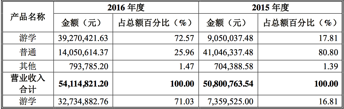 ?從上表可以看出,營業(yè)收入方面,普通旅游收入在 2016 年度占同期主營業(yè)務(wù)收入的比重為 25.96%,2015 年度為 80.80%,占比不斷下降;游學(xué)收入在2016年度占同期主營業(yè)務(wù)收入的比重為 72.57%,2015 年度為 17.81%,占比不斷上升。?