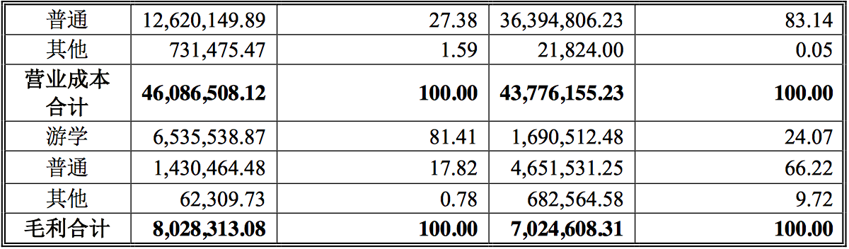毛利中,游學(xué)毛利在 2016 年度占同期毛利的比重為 81.41%,2015 年度 為 24.07%,占比不斷上升;普通旅游毛利在 2016 年度占同期毛利的比重為 17.82%,2015 年度為 66.22%,占比不斷下降。