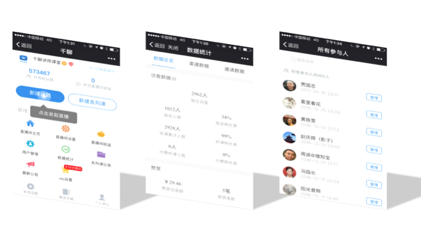 (4)幫助講師提升經(jīng)營(yíng)能力。擁有直銷(xiāo)、分銷(xiāo)、分享榜、邀請(qǐng)卡等傳播功能;單課收費(fèi)、系列課收費(fèi)、會(huì)員收費(fèi)、VIP收費(fèi)等變現(xiàn)功能;數(shù)據(jù)分析、粉絲對(duì)話、管理、新課推送、等用戶管理功能。