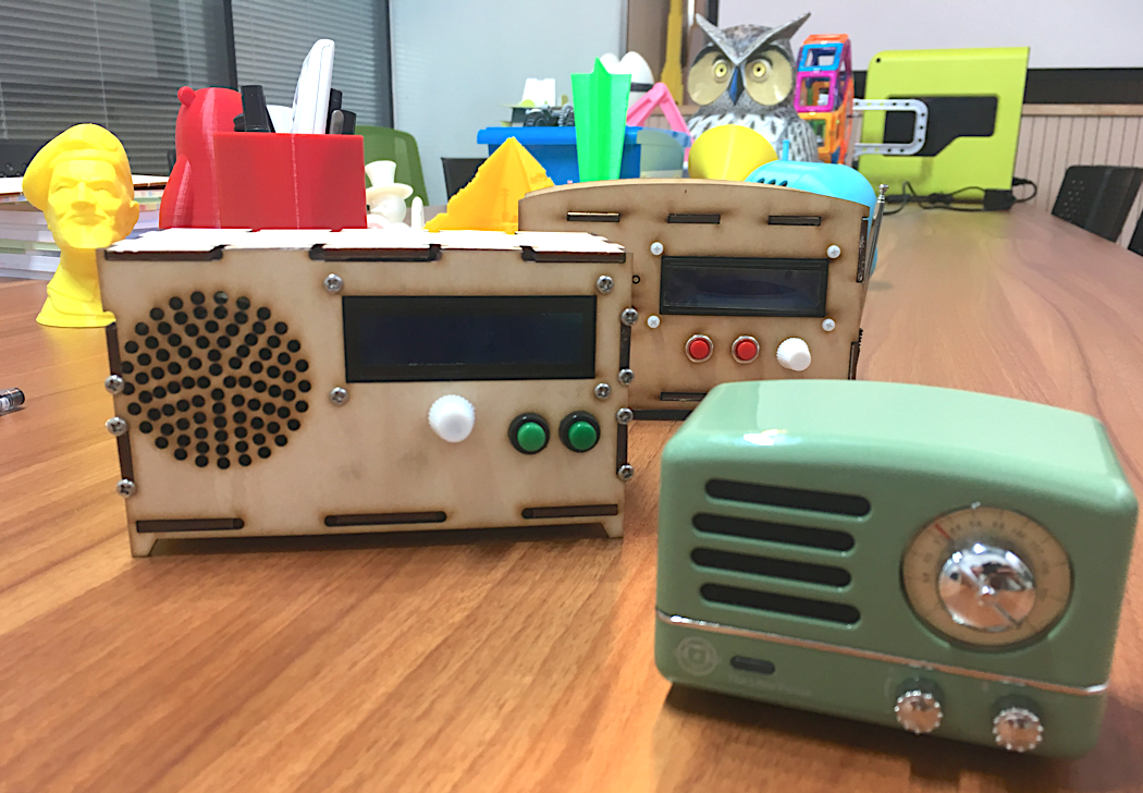 教學(xué)現(xiàn)場(chǎng)是創(chuàng)意共建的場(chǎng)景。一次教研員和寓樂(lè)灣的磨課時(shí),我們想“造物”,需要包含平面加工、電子元器件,想到播放器是不是符合設(shè)定。于是在課研人員和學(xué)校的老師上課的時(shí)候,現(xiàn)場(chǎng)突發(fā)奇想可以用“收音機(jī)”這個(gè)概念,學(xué)生們一發(fā)不收拾,做出了各種產(chǎn)品,融合了很多元素。最后這套課程海淀區(qū)廣泛都開(kāi)課。