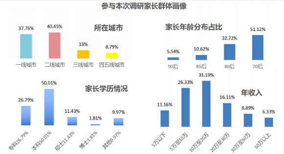 參與此次調(diào)查的家長,多數(shù)生活在一二線城市,合并占比近80%。由此可見,素質(zhì)教育的創(chuàng)業(yè)機(jī)會(huì)依然在一二線大城市。家長們的年齡多為70后和80后,分別占比51%和32.7%。本科以上學(xué)歷的占比超過70%。年收入超過10萬元的占比超過60%,其中10-20萬元的為31%,20-30萬元的占比為16%。
