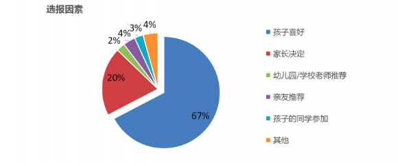 在選報(bào)因素上,67%的根據(jù)孩子的興趣選報(bào),也有20%的家長自己為孩子進(jìn)行選擇。