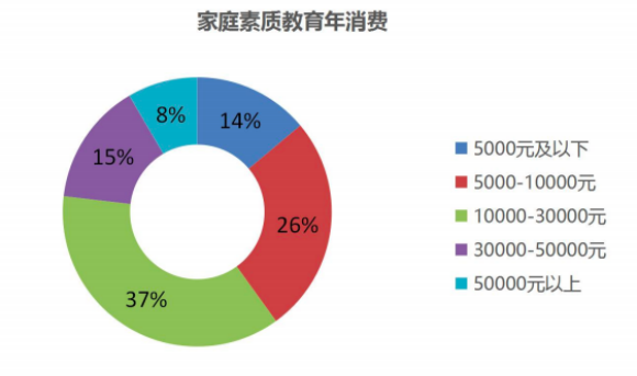 報(bào)告顯示,家庭素質(zhì)教育年消費(fèi)1萬元以上的家庭合計(jì)占比60% 。5千元到1萬元間的占26%,1-3萬元的占37%,有15%的家庭在3-5萬元之間。5萬元以上的為8%。