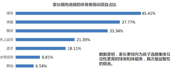 在體育教育領(lǐng)域,數(shù)據(jù)表明,家長更傾向?yàn)楹⒆舆x擇集體互動(dòng)性更高的球類和體能類,占比分別為45%和37.8%, 其次是益智性的棋類,占比33%,水上運(yùn)動(dòng)占比21%,武術(shù)類和冰雪運(yùn)動(dòng)分別占比18%與8.9%。