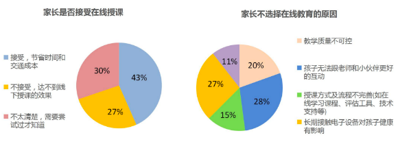 在素質(zhì)教育領(lǐng)域,在線授課也頗受歡迎,有43%的家長表示接受在線課程,認(rèn)為更為節(jié)省時(shí)間與交通成本,表示需要嘗試才知道的家長占比為27%。表示不接受在線課程的家長占比27%。不接受在線課程的家長中,有28%是擔(dān)心孩子無法在課程中與老師和伙伴更好地互動(dòng),27%的家長擔(dān)憂長期使用電子設(shè)備對孩子的影響,15%的家長認(rèn)為在線課程授課教學(xué)質(zhì)量不可控。