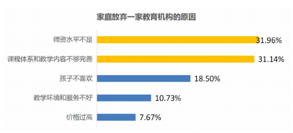 隨著消費(fèi)升級,家長越來越注重機(jī)構(gòu)的教學(xué)內(nèi)容、教學(xué)質(zhì)量和服務(wù),并更關(guān)注孩子對其是否有興趣,對于價(jià)格,并不敏感。報(bào)告顯示,家長們放棄一家教育機(jī)構(gòu)的原因,近32%表示是因?yàn)閹熧Y力量不足,31%的家長認(rèn)為課程體系和教學(xué)內(nèi)容不夠完善,因孩子不喜歡而放棄的家長占比10.73%,因?yàn)閮r(jià)格過高而放棄的,占比僅為7.67.