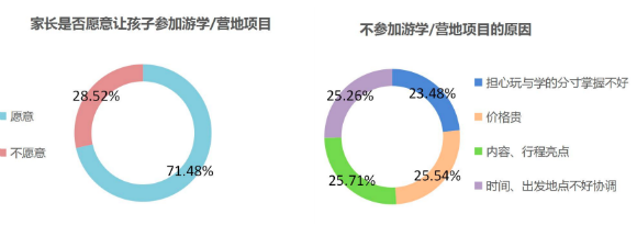 在研學(xué)領(lǐng)域,七成家長愿意讓孩子參加游學(xué)、營地項(xiàng)目。不參加游學(xué)、營地項(xiàng)目的原因比較平均。