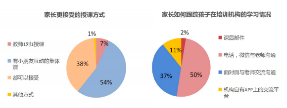 在授課方式上,54%的家長更希望孩子接受有互動(dòng)的集體課,希望1對1授課的只有7%,可見家長們更期待素質(zhì)教育課程具有社交屬性,孩子能在集體課堂多些互動(dòng)。家長又是如何了解孩子課程學(xué)習(xí)情況的呢?報(bào)告顯示,50%的家長使用電話微信與老師溝通了解,APP交流平臺(tái)占比為11%,面對面與老師交流依然是重要的方式,占比37%。
