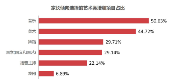 在藝術(shù)教育領(lǐng)域,調(diào)查顯示,在課程選擇上,音樂、美術(shù)仍然是家長首選。在藝術(shù)教育項(xiàng)目占比中,選擇音樂教育的為50%,選擇美術(shù)的為44.7%,舞蹈與國學(xué)分別占比29%,播音主持占比22%,戲劇為6.9%。