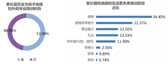 在生活素養(yǎng)類領(lǐng)域,根據(jù)報(bào)告,有近一半幼兒園或?qū)W校并未開始相關(guān)課程,這給予社會(huì)培訓(xùn)機(jī)構(gòu)留有更大的發(fā)展空間。孩子的情商、邏輯思考能力、表達(dá)能力是家長最為關(guān)注的核心素養(yǎng)能力。