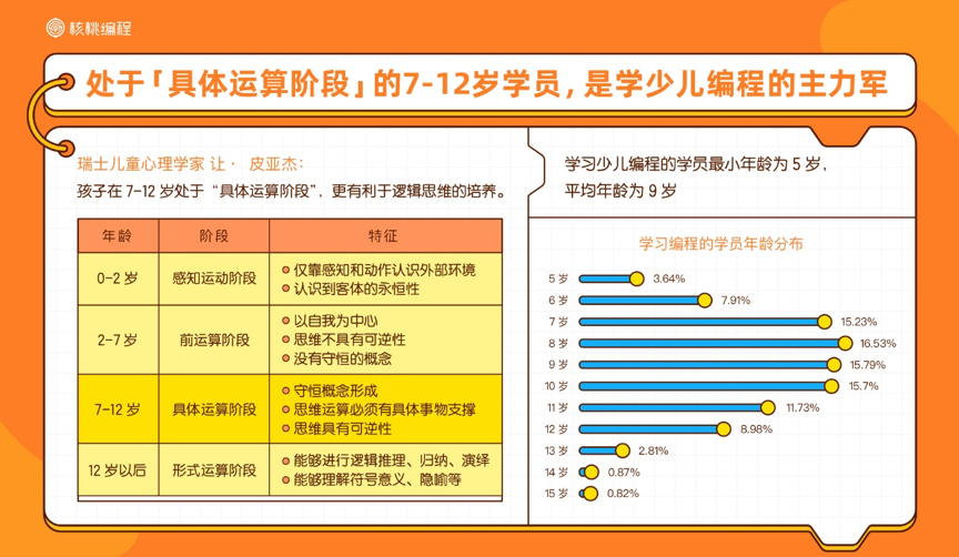當(dāng)然,與其他素質(zhì)教育相比,少兒編程教育具備一定的特殊性,需要保障學(xué)習(xí)成果的同時(shí)兼顧青少年的學(xué)習(xí)興趣。對(duì)于青少年,培養(yǎng)編程思維也擁有一個(gè)“黃金年齡段“。根據(jù)報(bào)告,7-12歲的青少年群體是學(xué)習(xí)少兒編程的主力軍。瑞士?jī)和睦韺W(xué)家讓·皮亞杰曾表示,孩子在7-12歲處于具體運(yùn)算階段,更有利于邏輯思維的培養(yǎng)。根據(jù)報(bào)告調(diào)研,學(xué)習(xí)少兒編程的學(xué)員最小年齡為5歲,平均年齡為9歲。