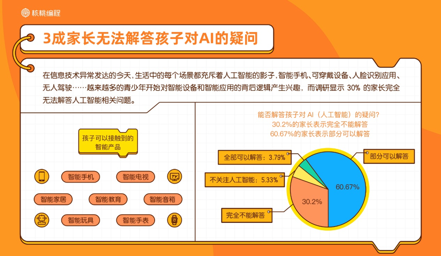 新一代人工智能正在全球范圍內(nèi)蓬勃興起,根據(jù)普華永道調(diào)研數(shù)據(jù)顯示,中國(guó)是AI設(shè)備滲透率最高的國(guó)家,21%的消費(fèi)者已經(jīng)擁有此類設(shè)備,52%的消費(fèi)者計(jì)劃購(gòu)買AI設(shè)備。智能手機(jī)、可穿戴設(shè)備、人臉識(shí)別等應(yīng)用可以說(shuō)隨處可見(jiàn),而越來(lái)越多的青少年開(kāi)始對(duì)智能設(shè)備和智能應(yīng)用的背后邏輯產(chǎn)生興趣。調(diào)研結(jié)果顯示,70.28%的家長(zhǎng)認(rèn)為少兒編程是培養(yǎng)邏輯思維,提升孩子學(xué)習(xí)能力的課程,近3成的家長(zhǎng)認(rèn)為是適應(yīng)人工智能時(shí)代必備技能。