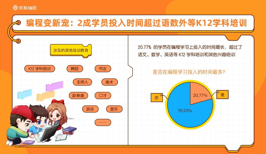 報(bào)告發(fā)現(xiàn),超過(guò)五分之一的學(xué)員在編程學(xué)習(xí)上投入的時(shí)間最長(zhǎng),超過(guò)了語(yǔ)文、數(shù)學(xué)、英語(yǔ)等 K12 學(xué)科培訓(xùn)和其他興趣培訓(xùn)。其中,AI人機(jī)雙師模式可以說(shuō)是2019年整個(gè)在線教育行業(yè)的新發(fā)現(xiàn),核桃編程采用的AI人機(jī)雙師教學(xué)模式,通過(guò)自適應(yīng)的練習(xí)系統(tǒng)和導(dǎo)師輔導(dǎo)實(shí)現(xiàn)大規(guī)模的個(gè)性化教學(xué),同時(shí)配合項(xiàng)目制與劇情化交互體驗(yàn)的新型課程模式,讓學(xué)生們可以在學(xué)習(xí)編程的過(guò)程兼顧興趣和效率。