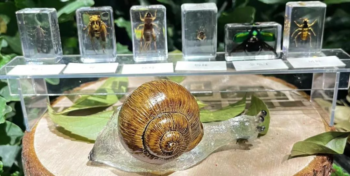 以《奇妙的昆蟲之旅》這一主題為例,其盒子就包含六枚滴膠動物標(biāo)本、一枚距今約1億年的蟲珀、三只圓碟及一套制作蝴蝶標(biāo)本的裝置。這些頗有巧思的小物件,格外吸引孩子的目光。