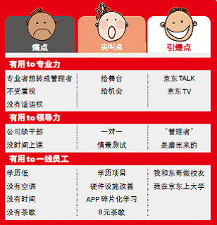 京東有5萬(wàn)名員工,將近4萬(wàn)人都是一線員工,他們有四個(gè)痛點(diǎn):一是學(xué)歷低,大部分都是高中或初中學(xué)歷;二是工作環(huán)境差,沒(méi)有空調(diào);三是沒(méi)時(shí)間參加培訓(xùn);四是沒(méi)有茶歇。在培訓(xùn)滿意度調(diào)查表里,有員工表示“公司不重視我們的培訓(xùn)”、“我們的培訓(xùn)不像培訓(xùn),更像會(huì)議,因?yàn)闆](méi)有茶歇”。