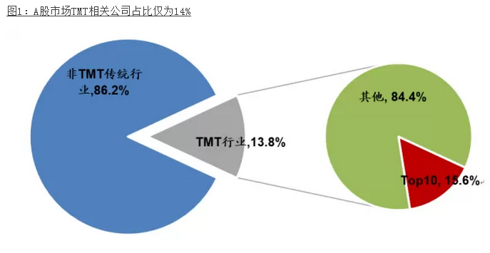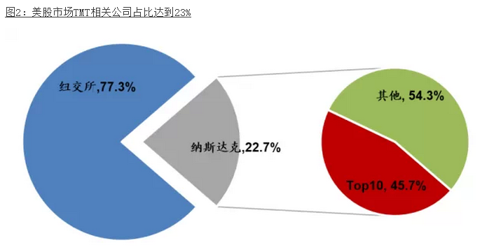 中觀層面,泡沫有限。股市反應(yīng)的是人心,是投資者對未來預(yù)期的映射。股市市值結(jié)構(gòu)反應(yīng)未來經(jīng)濟結(jié)構(gòu)。作為經(jīng)濟轉(zhuǎn)型最重點方向,目前國內(nèi)TMT行業(yè)上市公司市值占比14%,仍低于美國23%的水平,為真正的互聯(lián)網(wǎng)企業(yè)留足空間(圖1、圖2)。