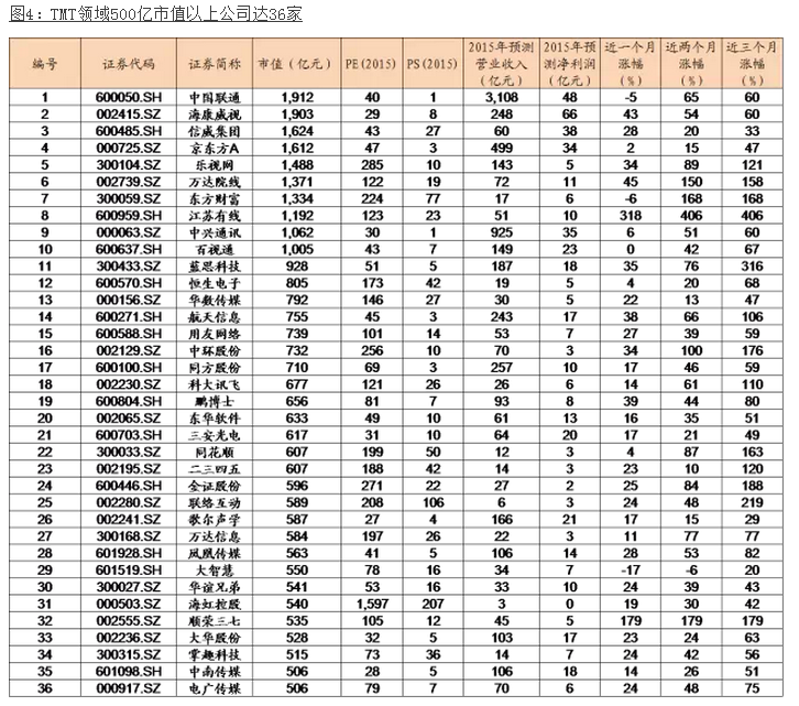 百億魔咒已破,龍頭公司仍待挖掘。以樂視網(wǎng)、東方財富等市值超越千億為標(biāo)志,目前百億美金魔咒有所打破,部分投資者看到了龍頭公司的巨大發(fā)展空間(圖5)。根據(jù)前期數(shù)據(jù),我國TMT龍頭公司市值占比遠(yuǎn)小于美國資本市場。他們快速填實泡沫及進(jìn)一步成長為巨頭的過程,值得投資者相伴。