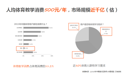 目前,人人趣學(xué)主要是藝術(shù)和體育兩個品類。2015年互聯(lián)網(wǎng)覆蓋體育人群超過2.7億,看看下邊的圖,接近80%的體育人群,其實是有學(xué)習(xí)需求的,有學(xué)習(xí)需求他一定就會花錢,這個市場是非常大。也是因為這樣的原因,我們才愿意切入到這個市場當(dāng)中來。如果你想用教育來改變一些事情,我想應(yīng)該做大的,而不應(yīng)該局限于在一些很小的點。
