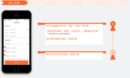 這是我們的兩個產(chǎn)品,我簡單說一下,這是老師入駐的流程,注冊、填寫資料,填寫自己的日程,我們平臺做一個認(rèn)證,認(rèn)證結(jié)束后,才會在平臺上展示。學(xué)院可以查找老師的資料、圖片、視頻,我們每個老師會做一個視頻去展示,還支持即使通訊在線的約課一系列的功能。我們的學(xué)員端線上選課、支付費用、線上約課,線下授課,這是一個完整的流程。