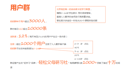 另外,我們做了一個用戶群,主要是媽媽,種子用戶超過3000人,群內(nèi)的每日UGC超過1000條,活躍度12%,我們有超過1000個用戶注冊人人趣學(xué)的客戶端。昨天我們剛做完1500人的線上講座,這個講座由人人趣學(xué)的老師和專家進(jìn)行講座,貢獻(xiàn)接近10萬的閱讀。這是講座完了之后,家長主動分享到他自己朋友圈的內(nèi)容。