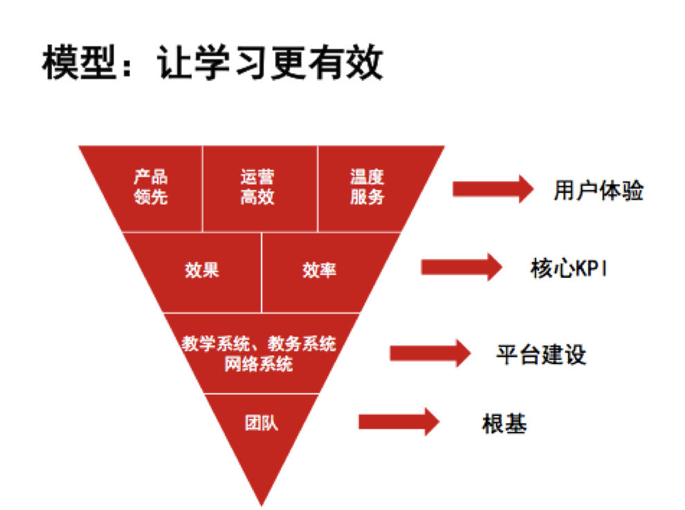 這是學而思的基因圖譜,核心是團隊,我們有三個系統(tǒng),我們這五年基本上是圍繞著教育過程和教育結(jié)果來服務(wù)的。我們希望學習的過程當中,單位時間的學習效果能夠更高效。在起點和終點無法改變的時候,如果能夠改變一些過程,或許能夠給到教育這個行業(yè)帶來一些幫助和推力。效率指的是內(nèi)部團隊的管理效率,不單指學生的學習效率,我們希望團隊在運營效率上通過互聯(lián)網(wǎng)的平臺工具,提升我們效率。我們希望最后呈現(xiàn)在客戶的面前的,是一個產(chǎn)品領(lǐng)先,高效運營,并且有溫度的一個機構(gòu),這是我們的用戶體驗的層面。