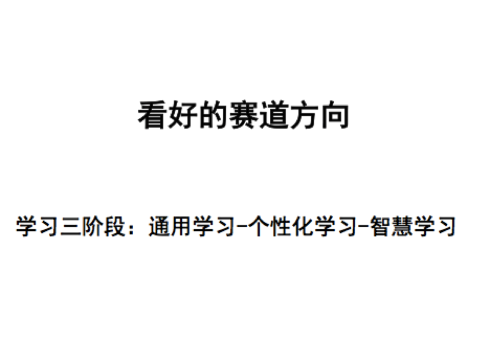學習的三階段,我們認為原來的學習在工業(yè)的背景情況下是通用的學習,后來出現(xiàn)了學大、京翰,現(xiàn)在出現(xiàn)了輕輕,他們希望能夠解決學習的個性化問題。毫無疑問,如果你將來想成為不同的人,你確實不應(yīng)該從小學到初中到高中,前面12年到16年學的都是同樣的東西,最后一年開始進行專業(yè)化的分科,其實那個時候你已經(jīng)油鹽不進了。我們講由學習目標的導向去推學習的路徑應(yīng)該有不同的練功渠道。個性化的學習是有機會的,而且現(xiàn)在的模式也存在很多的問題和缺陷,能不能解決這個缺陷我們拭目以待,對于小班教學和大班教學,智慧學習是我們希望未來能夠看到的方向,機器輔助于人解決一部分的學習問題,讓人的因素發(fā)揮更有價值。我們看好這個跑道的未來發(fā)展方向。