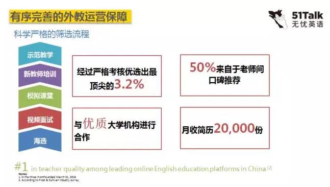 老師是經(jīng)過嚴(yán)格篩選的,遴選3.2%的優(yōu)秀老師。51Talk月收簡(jiǎn)歷2萬份,只有600多名老師最終通過嚴(yán)格審核。