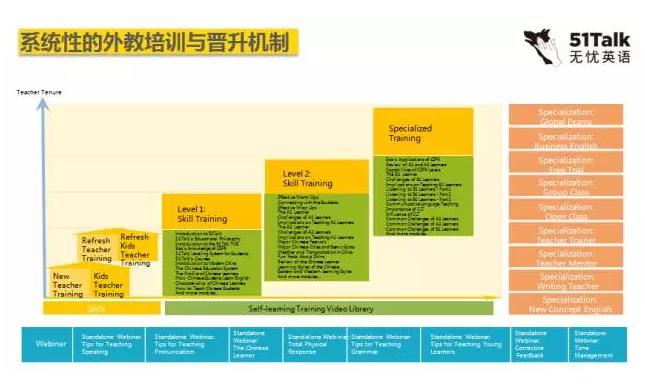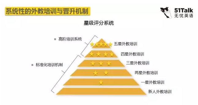 星級(jí)評(píng)分包括標(biāo)準(zhǔn)化培訓(xùn)機(jī)制和高階培訓(xùn)系統(tǒng),晉升機(jī)制保證老師熟練的運(yùn)用體系,融入到教學(xué)模塊里面去。所以我們的老師從新人到一星、二星、三星、四星、五星,每升一星都必須要通過下一階段的培訓(xùn)。如果他自己不愿意往上升,肯定得不到更高的Pay,因?yàn)樾羌?jí)高會(huì)有更多的學(xué)生來訂他的課。