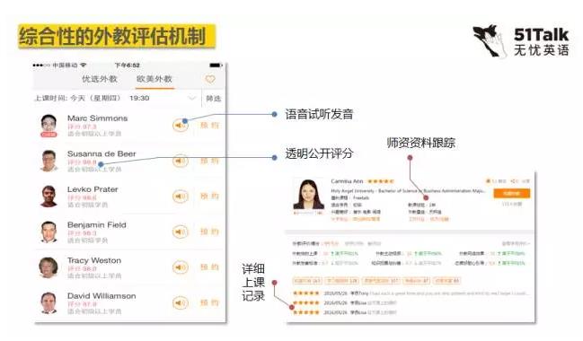 老師要晉級(jí)就要通過不同的培訓(xùn)和測(cè)試,評(píng)估系統(tǒng)首先是學(xué)生的評(píng)估系統(tǒng),根據(jù)上課的打分情況決定教師的排位。每個(gè)學(xué)生上課都會(huì)做詳細(xì)記錄,并且老師的資料我們?cè)诓粩噙M(jìn)行跟蹤。