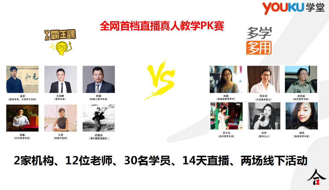 酷斗健康減肥訓(xùn)練營是一個(gè)全程直播的活動(dòng)。這次的活動(dòng)采取兩家教育機(jī)構(gòu)PK的模式進(jìn)行。兩家教育機(jī)構(gòu)中各有6位老師,6位老師各帶15名學(xué)員全程直播,有點(diǎn)像教育類的真人秀的感覺。整個(gè)直播的過程歷時(shí)14天,老師和學(xué)員每天有2小時(shí)的直播,教師教學(xué)過程直播,學(xué)員學(xué)習(xí)過程也全程直播。我們的口號(hào)是“全民目擊,讓ta瘦”。