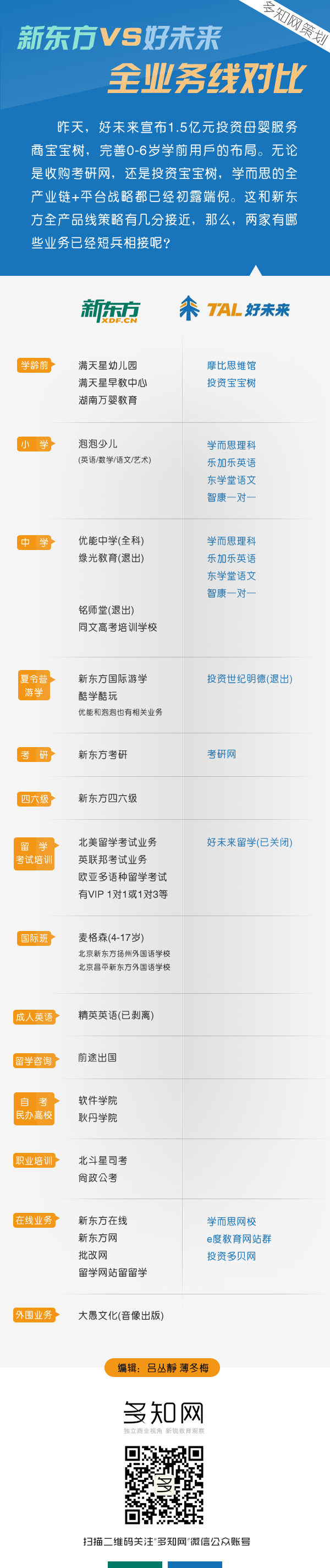昨天,好未來(lái)宣布1 5億元投資母嬰服務(wù)商寶寶樹(shù),完善0-6歲學(xué)前用戶(hù)的布局。無(wú)論是收購(gòu)考研網(wǎng),還是投資寶寶樹(shù),學(xué)而思的全產(chǎn)業(yè)鏈+平臺(tái)戰(zhàn)略都已經(jīng)初露端倪。這和新東方全產(chǎn)品線策略有幾分接近,那么,兩家有哪些業(yè)務(wù)已經(jīng)短兵相接呢?