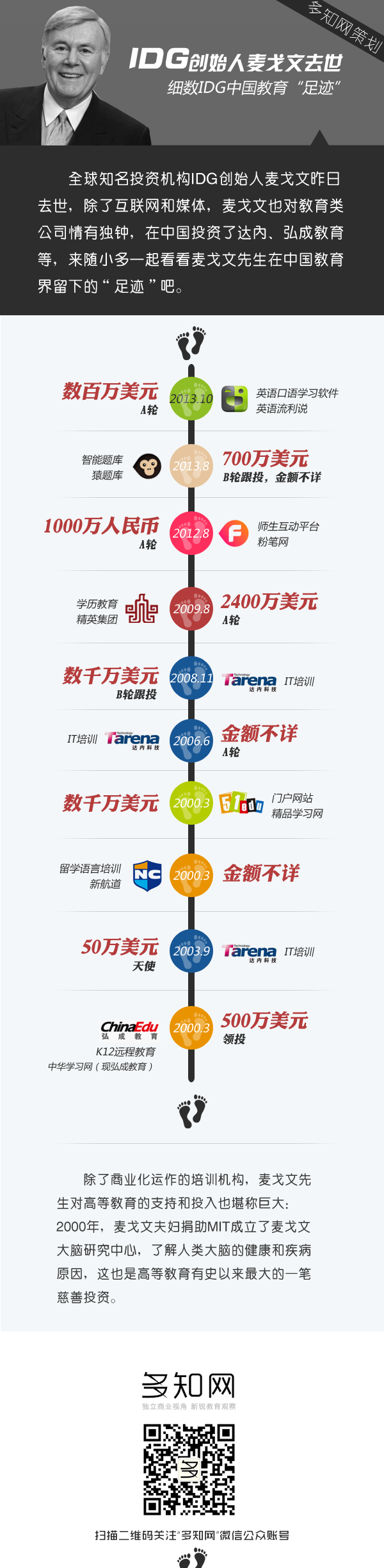 全球知名投資機構(gòu)IDG創(chuàng)始人麥戈文去世,除了互聯(lián)網(wǎng)和媒體,麥戈文也對教育類公司情有獨鐘,IDG在國內(nèi)投資了達內(nèi)、弘成教育等,來隨小多一起看看麥戈文先生在中國教育界留下的“足跡”吧。